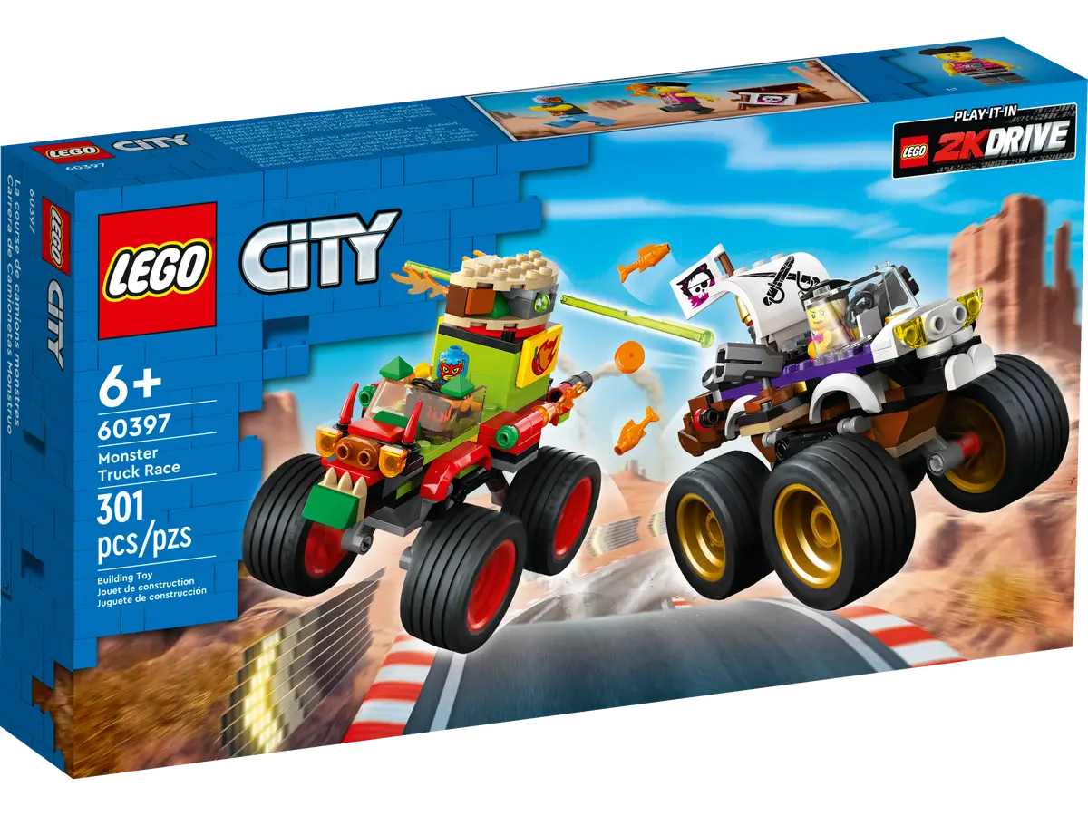 Fans of toy cars and the LEGO® 2KDRIVE video game can enjoy endless hours of fun with this 7+ LEGO City Monster Truck Race (60397) playset, including 2 funny monster trucks with cool functions, as featured in the game. Kids can enjoy hands-on 2KDRIVE ction or stage their own epic races between the taco and pirate driver minifigures.