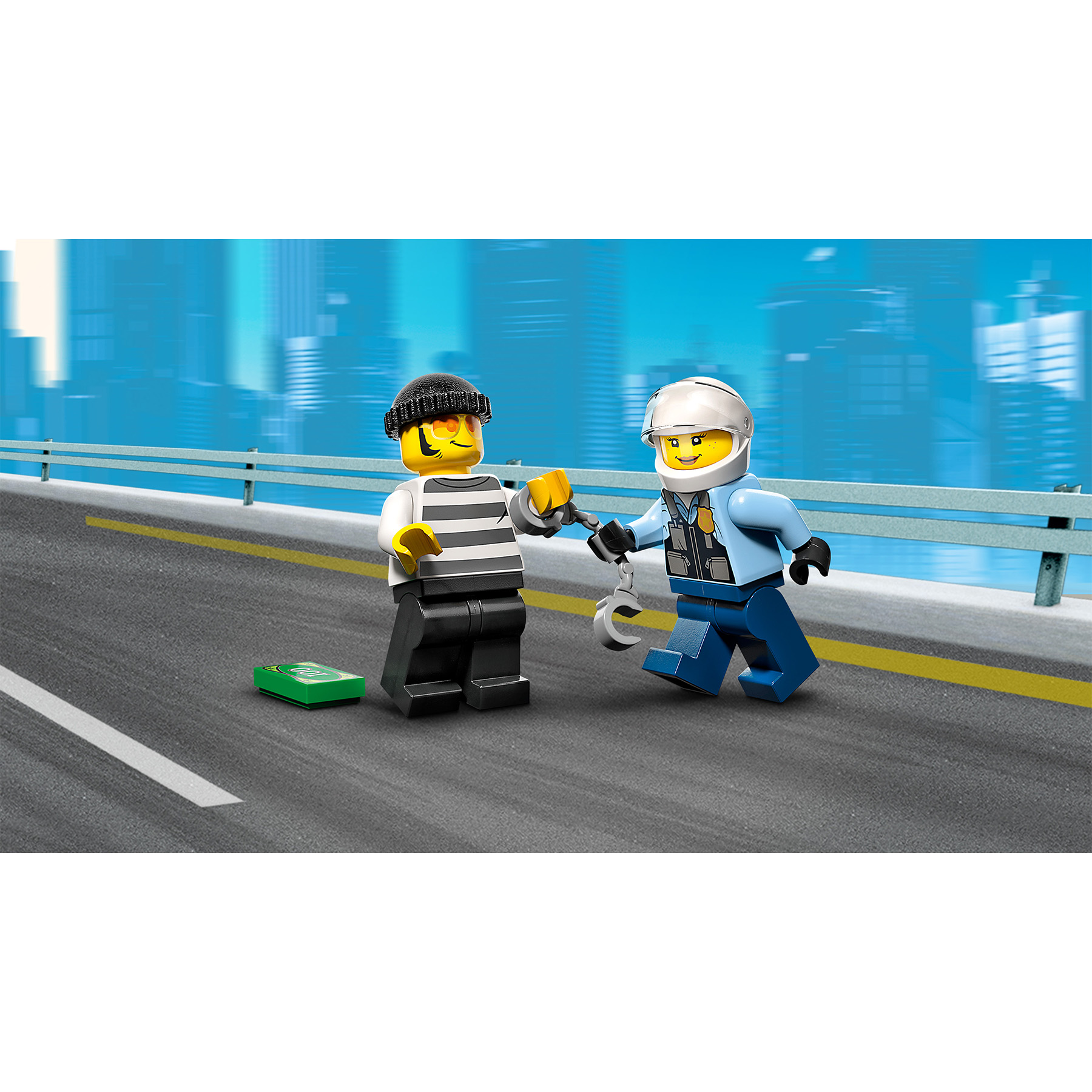 SCREECH! Hey! A crook is speeding away with stolen money! Mobilize the superfast police pursuit motorbike. Help the LEGO® City police officer catch the crook, then slap on the handcuffs and transport him to the nearest jail. Awesome crook-catching action awaits in LEGO City!